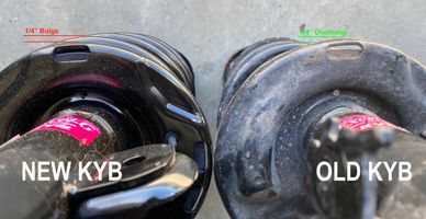 Over the past year we have had a couple issues with newer KYB struts on the GEN 3 Prius and Prius V in both lifted and non-lifted form. After replacing the struts a popping/clunking noise would occur when turning or going over bumps. Upon further investigation we noticed the springs rubbing on the small bulges on the inside of the fender well (circled in yellow in the image below) causing the noise. When comparing the old KYB struts and new KYB struts it became apparent that the springs on the new KYB struts had a larger outside diameter than the old ones causing them to overhang beyond the spring retainers (demonstrated in the images below, circled in green and red). The easiest way to observe this is to place the struts on the ground with the side that would be towards the engine facing down and see if the spring touches the ground or the spring retainers touch the ground. If the spring touches the ground then it’s a good possibility that the spring will rub the bulges on the inside of the fender well. We also noticed that the new springs had an additional coil winding as well, with the old spring having 5 windings and the new spring having 6 windings. We have been in contact with KYB about these issues and unfortunately they have been unable to track down and pinpoint exactly where this production flaw is coming from, and haven’t been much help trying to mitigate the issue. Our assumption is that there was some change in the production process or production facility after COVID that created the issue.